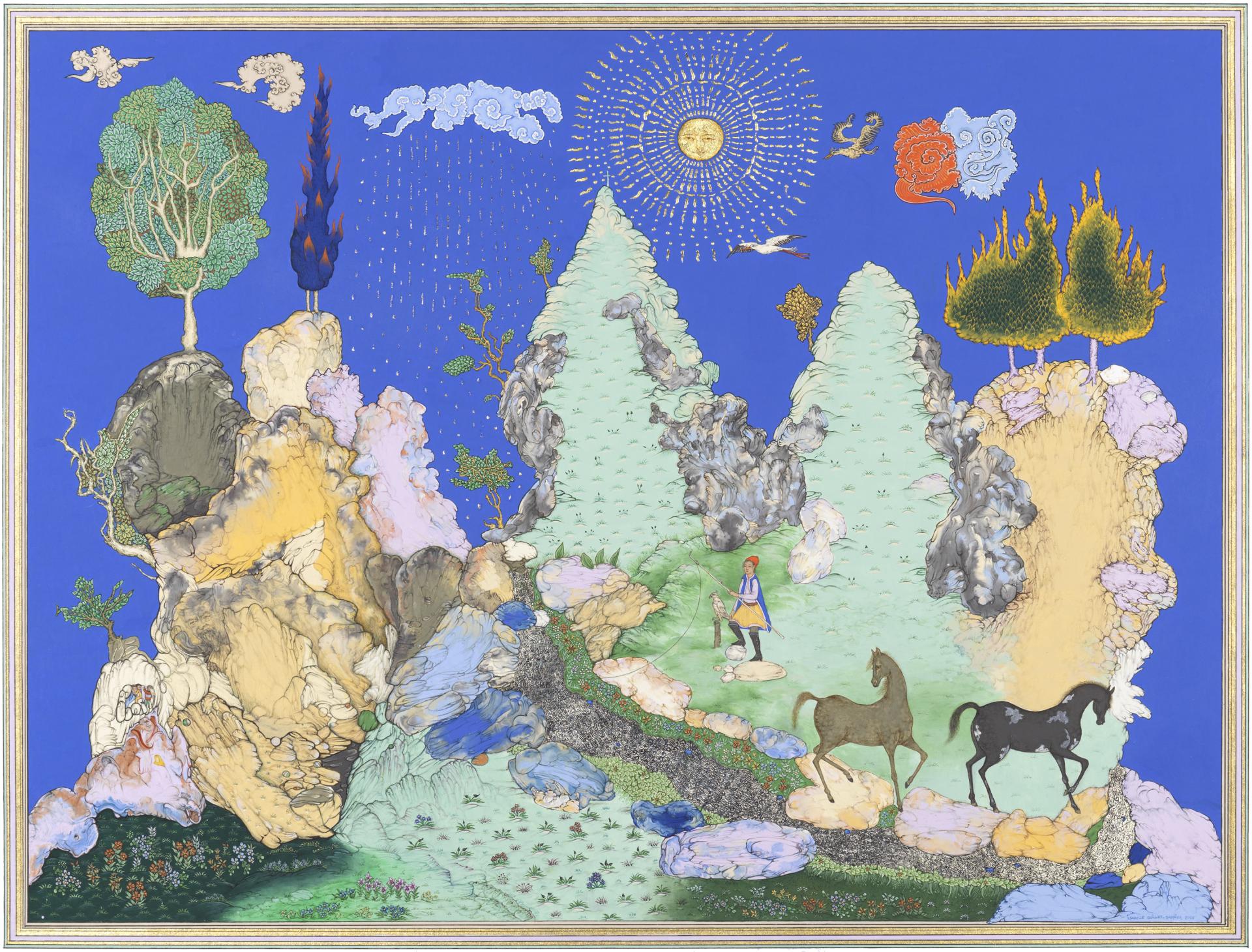 La miniature persane offre une vision paradisiaque qui se matérialise dans le jardin. Agrémenté d’arbres, celui-ci fait coexister les saisons - l’automne et le printemps - des fontaines, des rivières argentées, des montagnes aux couleurs chatoyantes, des ciels d’or. Toute la beauté de la miniature persane se trouve dans ses couleurs splendides et l’abondance de ses nombreux détails. Le charme de la miniature réside dans son élégance, ses courbes légères et son raffinement. La miniature persane ne s’embarrasse pas de perspective ou de trop de réalisme : c’est une ouverture vers le rêve, vers « les jardins du paradis ».